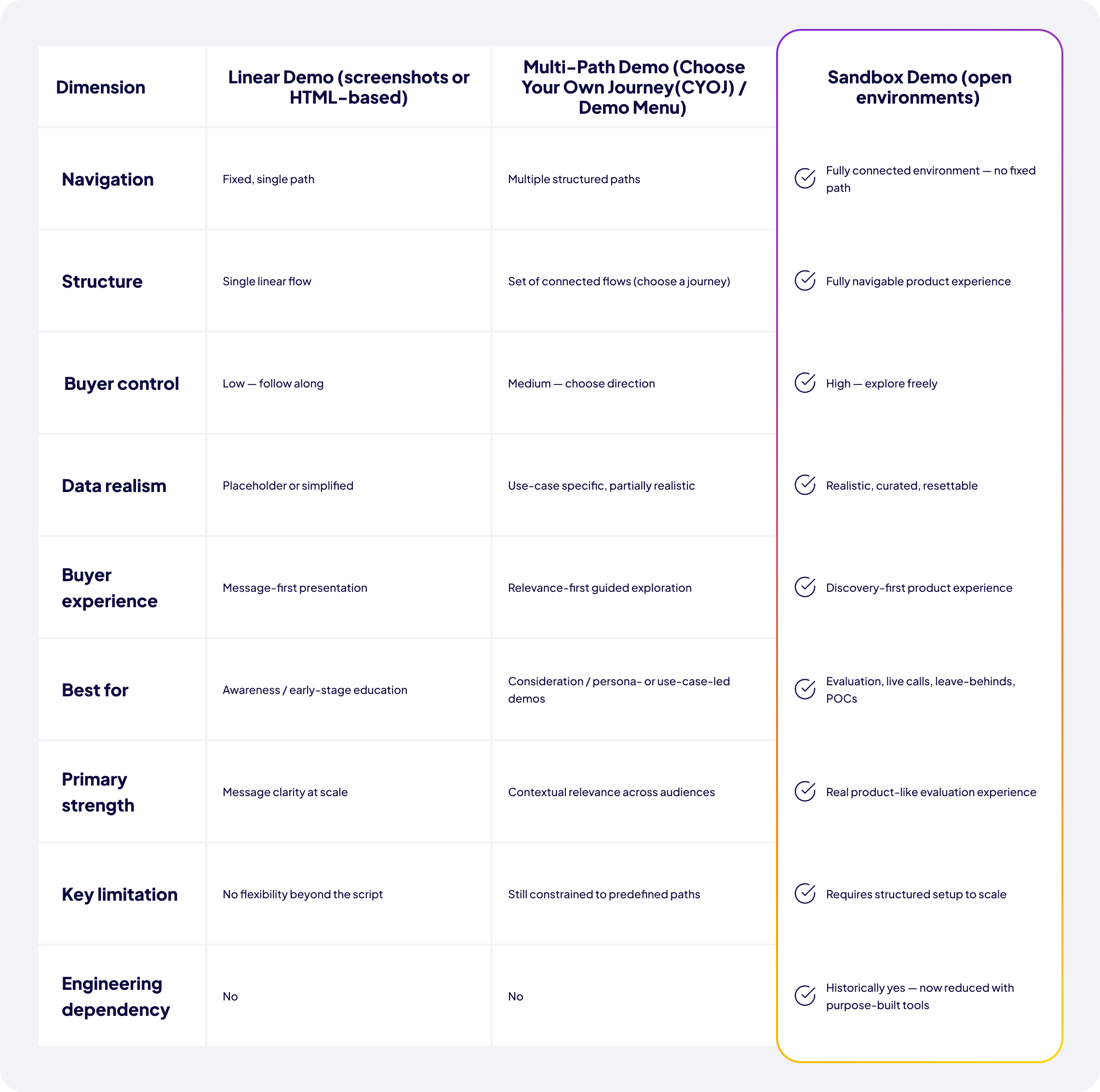 - Sandbox demos give buyers — and presenters — the freedom to move through the product in any direction, following the conversation rather than a script
