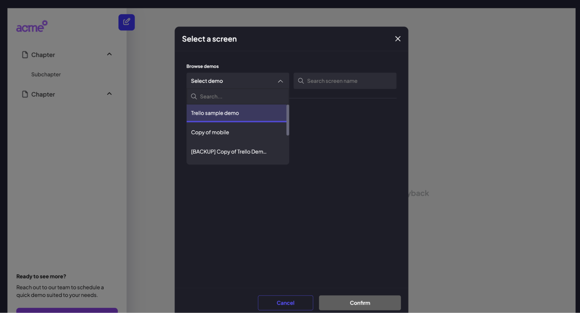 Choose a demo or pick a screen from the list you’d like to link. Once done, click confirm to proceed.