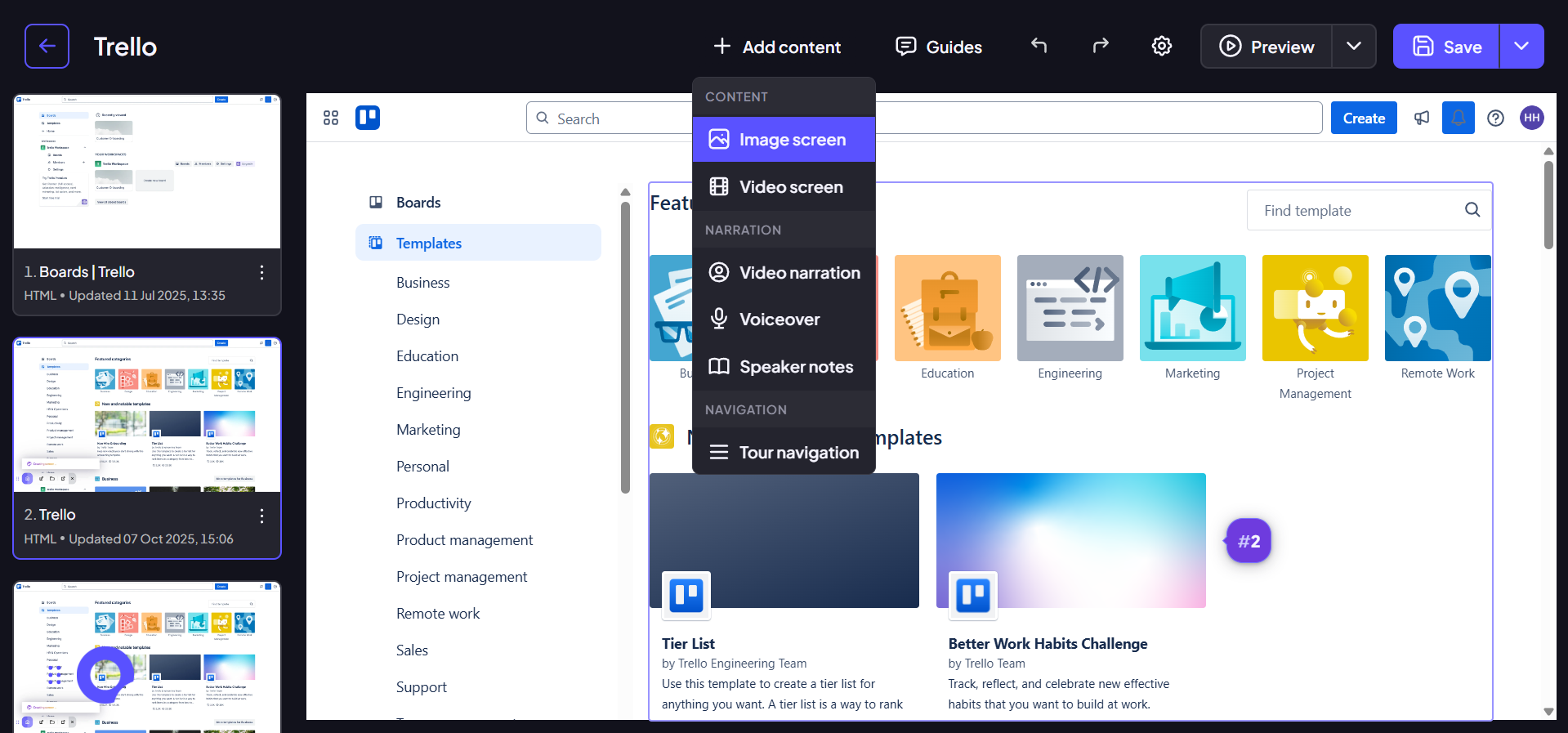 To add an image, select "Add content" and then "Image screen."