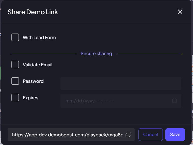 A Share modal will appear. At the bottom of the sharing modal, you’ll find your unique demo URL. You can copy this link directly or use the following option to identify your viewers: