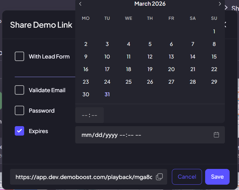 Expires: Use this to set a "shelf life" for your demo. Select a specific date and time from the calendar; once this deadline passes, the link will automatically deactivate and become inaccessible.
